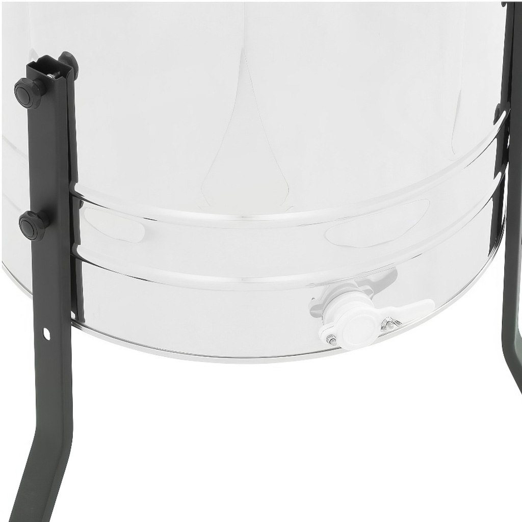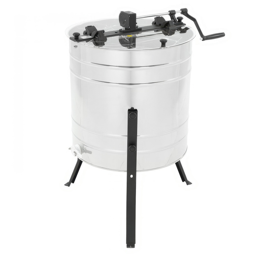 Velkou předností tohoto medometu je jeho univerzálnost. Nemusíte se omezovat na jednu rámkovou míru – medomet zvládne prakticky všechny rozšířené formáty. Menší rámky, jako jsou 39×15, 39×17, Langstroth 159 či Optimal 42×17, lze vkládat po dvou do jednoho koše, což výrazně zrychluje práci při vytáčení. Ruční pohon pomocí kliky zajišťuje plnou kontrolu nad otáčkami a šetrné zacházení s plásty.